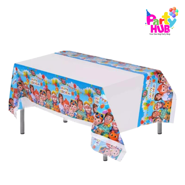 Colorful Cocomelon plastic table cover designed to protect tables while adding a fun, themed touch to your party setup.